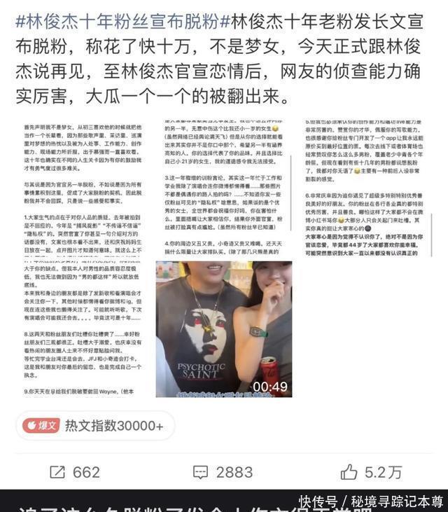 粉丝脱粉卖掉所有林俊杰相关周边 面对外界对于这位年轻嫂子的质疑,林俊杰当众维护七七,表示虽然自己以前叫林三岁,但他不傻,可谓是偶像亲自拆了粉丝的操心墙。 最近的娱乐圈喜事一件接一件,林俊杰官宣完恋情,他的师妹金莎也在冰岛钻石沙滩,被小自己17岁的孙丞潇求婚了。