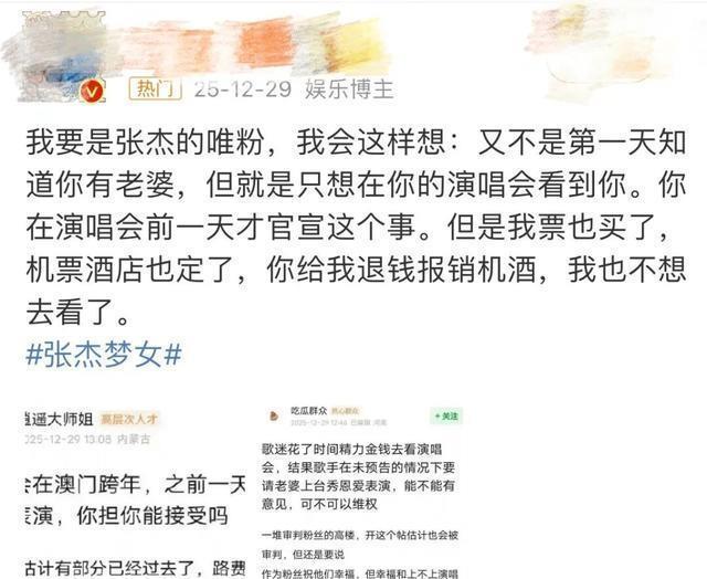 林俊杰关于“林三岁不傻”的回应,无疑是在对抗粉丝们的心里预期,在刚刚过去的跨年夜,张杰也亲自对抗了公众对于“嫂子”的评判。 2025年12月31日晚,张杰跨年演唱会在澳门举行,在此之前嫂子露面环节遭到粉丝抗议,但谢娜如约而至。 舞台上响起《无可救药》的熟悉旋律,只见扎着双马尾的谢娜缓缓登台,与张杰穿情侣装跳了甜蜜双人舞,两人触碰鼻尖,错位接吻。 谢娜与张杰跨年夜跳双人舞 台下有人疯狂呐喊,有人沉默抗议。大部分粉丝认为,自己花钱买票是为了来看张杰演出,而非看张杰、谢娜夫妇秀恩爱。 有粉丝气得晒出上万块的澳门机票酒店订单,觉得花这么多钱飞来被骗了,临开场前一天才得知有“夫妻演唱环节”,自己的消费者知情权被侵犯了,清一色地要求张杰工作室拒绝捆绑。